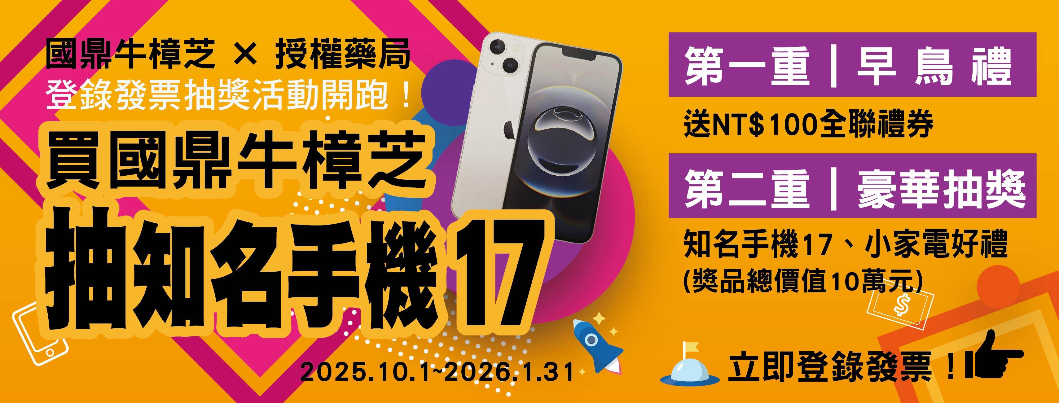 【國鼎牛樟芝 × 授權藥局】10月-2026/1月 年終發票登錄抽獎活動辦法及注意事項