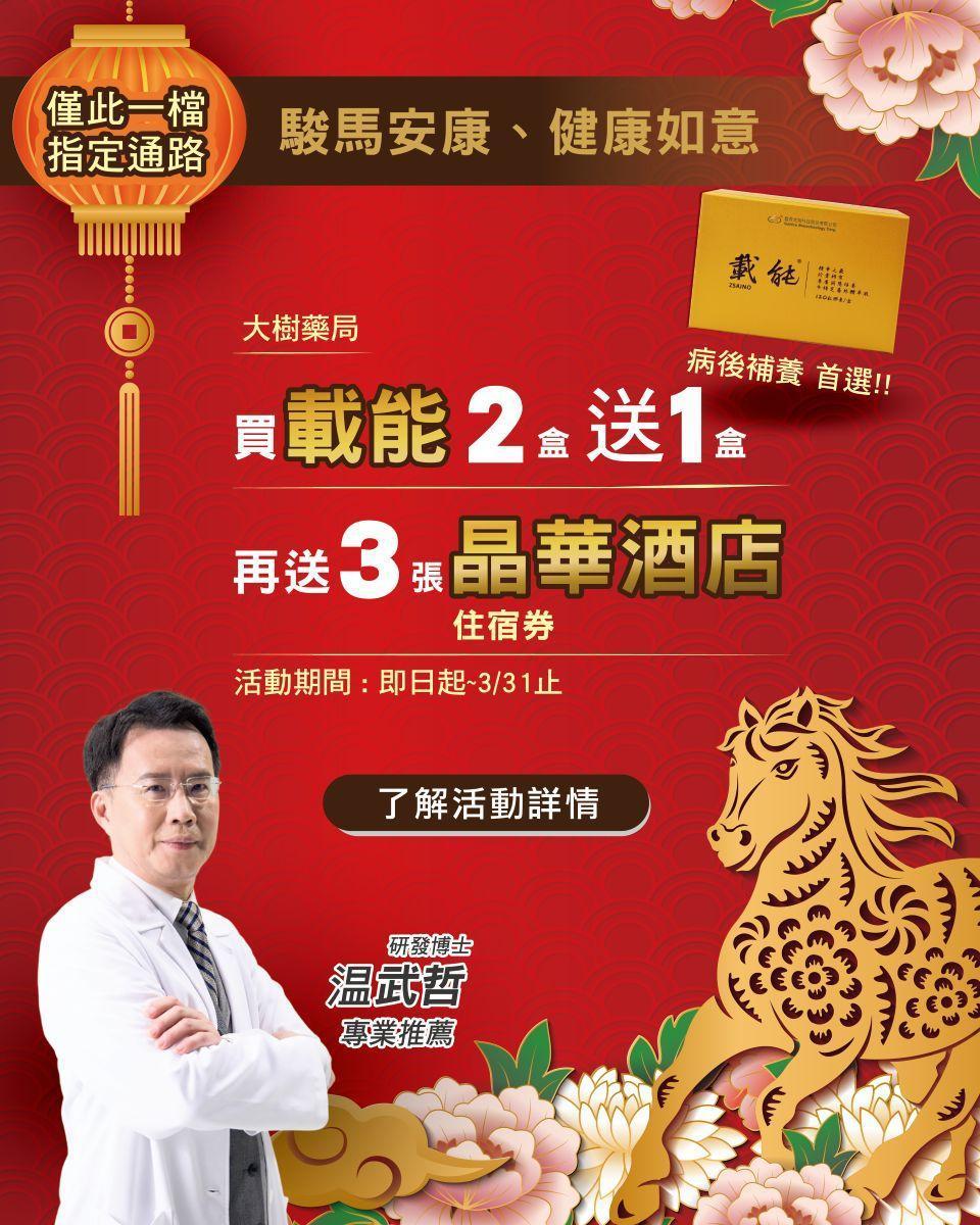 駿馬安康、健康如意—指定通路買載能2盒送1盒,再送3張住宿券